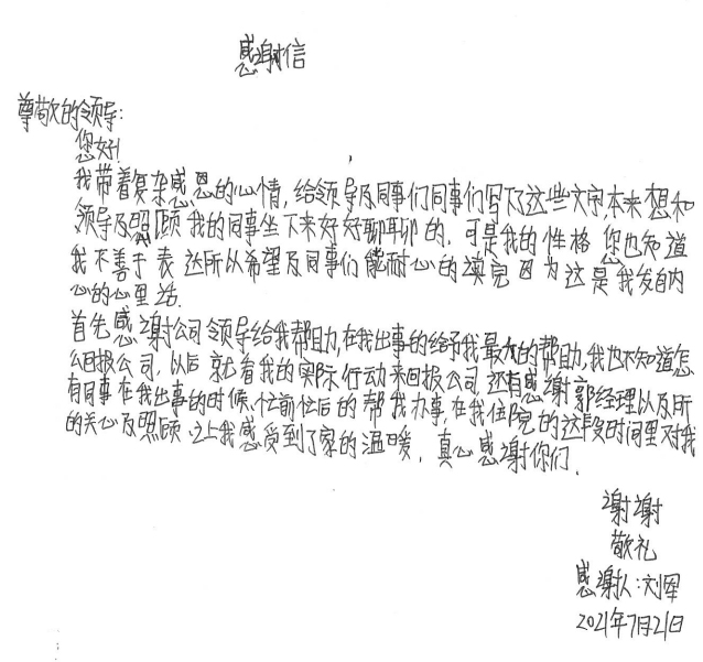 经过半个月治疗休养,刘军手部已无大碍。出院后的他写了一封感谢信并为公司送了一面锦旗,他说道,是米兰官方网页版这个大家庭让他感受到了关怀和温暖,他表示要把这种关怀变成工作上的动力,争取早日返回工作岗位,努力工作,回报大家的关心和关爱。